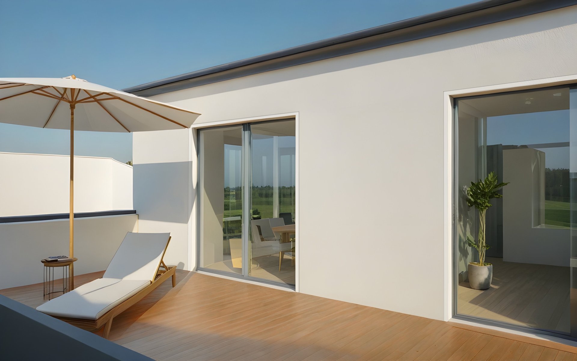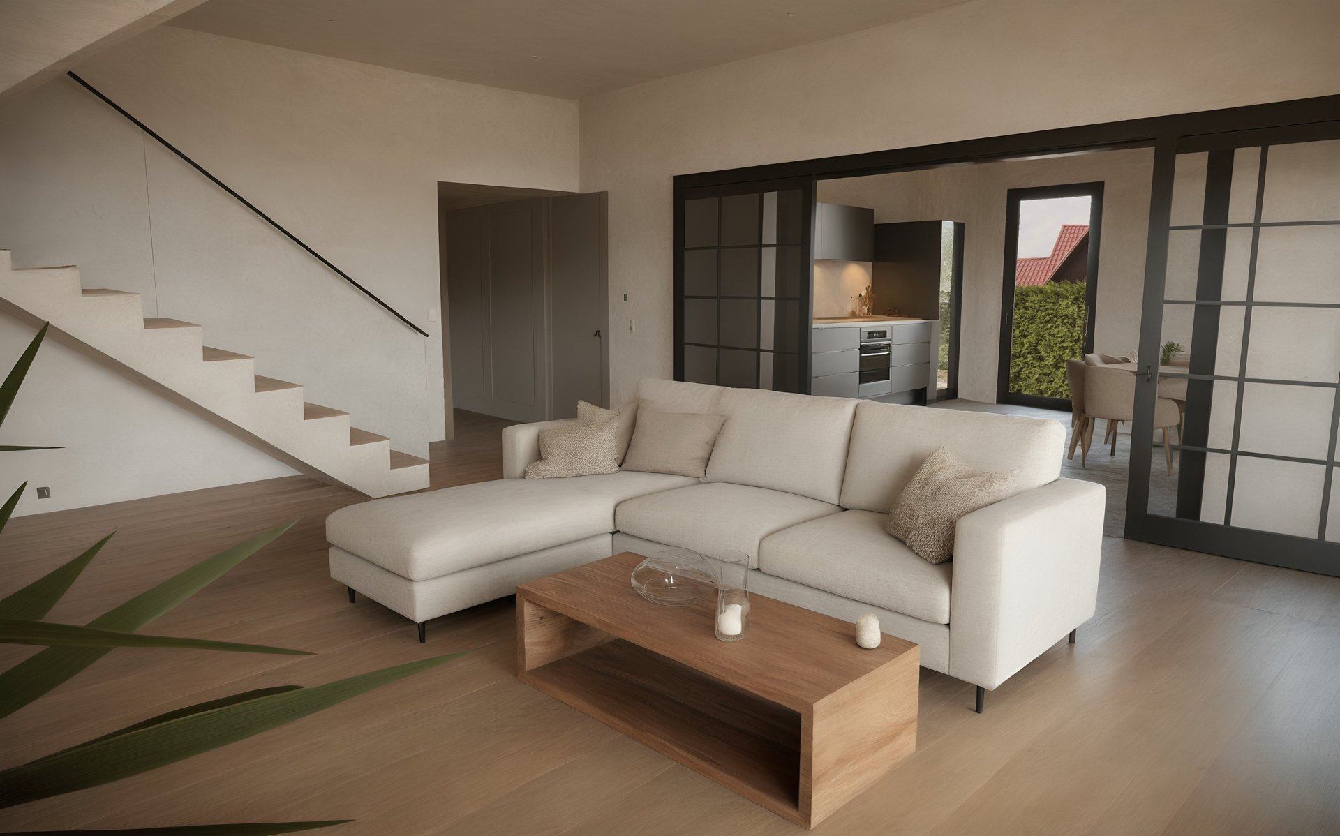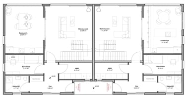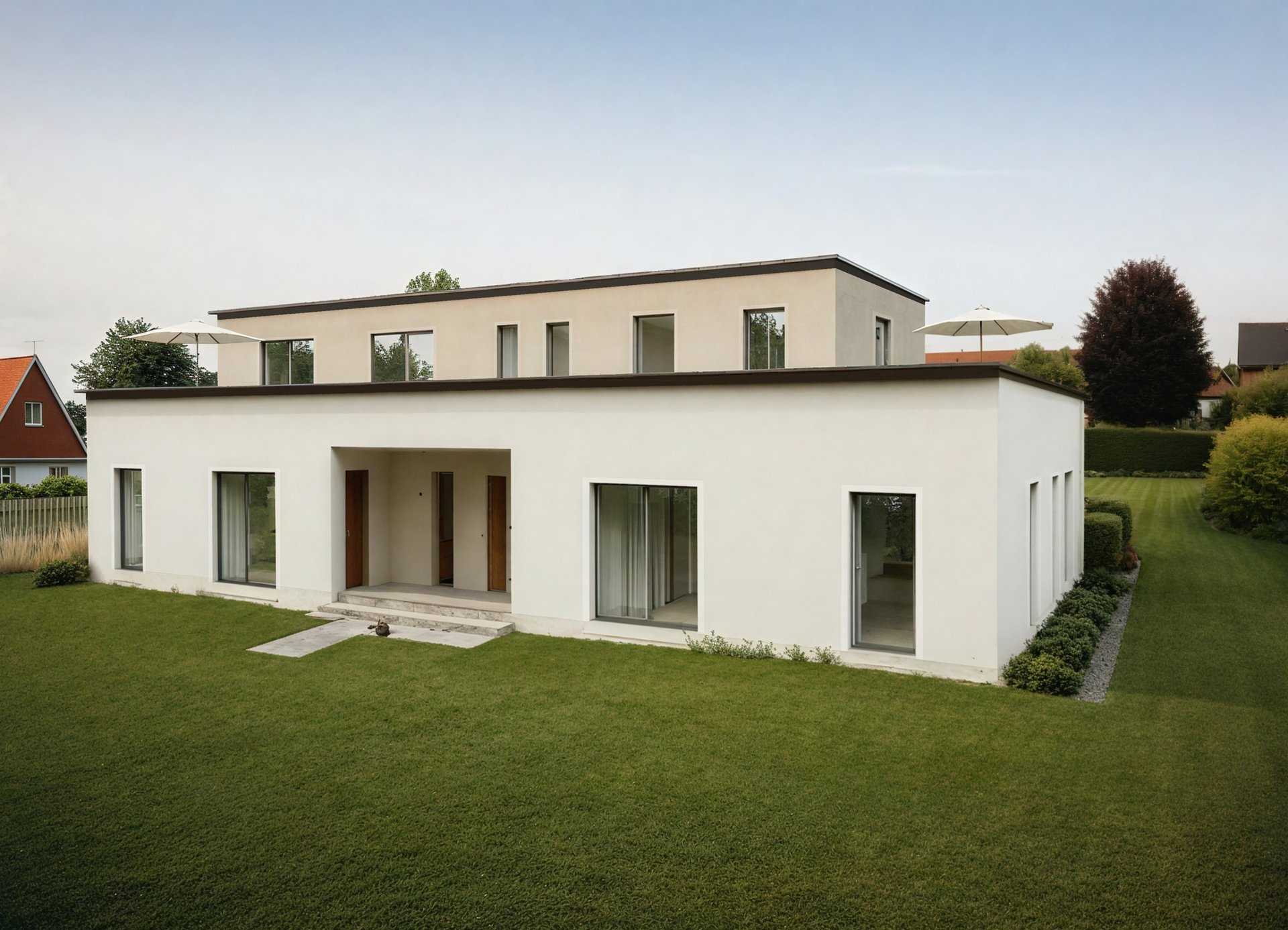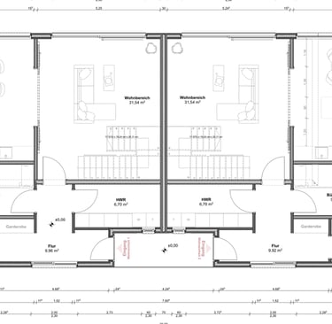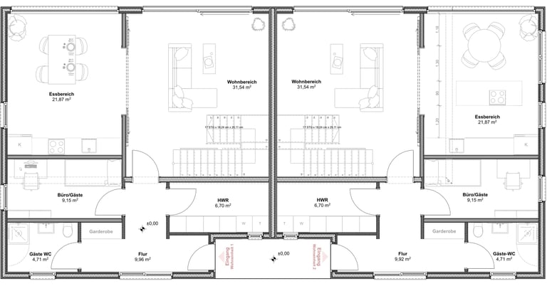 Das Doppelhaus wird in Holzständerbauweise als Fertighaus gefertigt. Im Innenraum werden großzügige, moderne Räume geschaffen welche sich durch große Fensterfronten in den Garten öffnen.