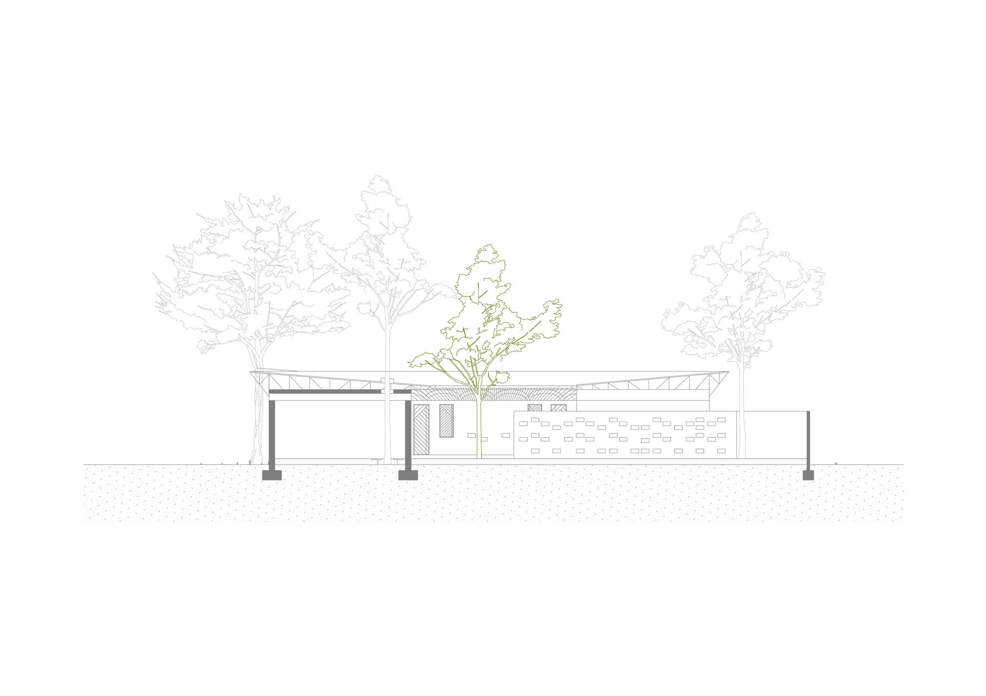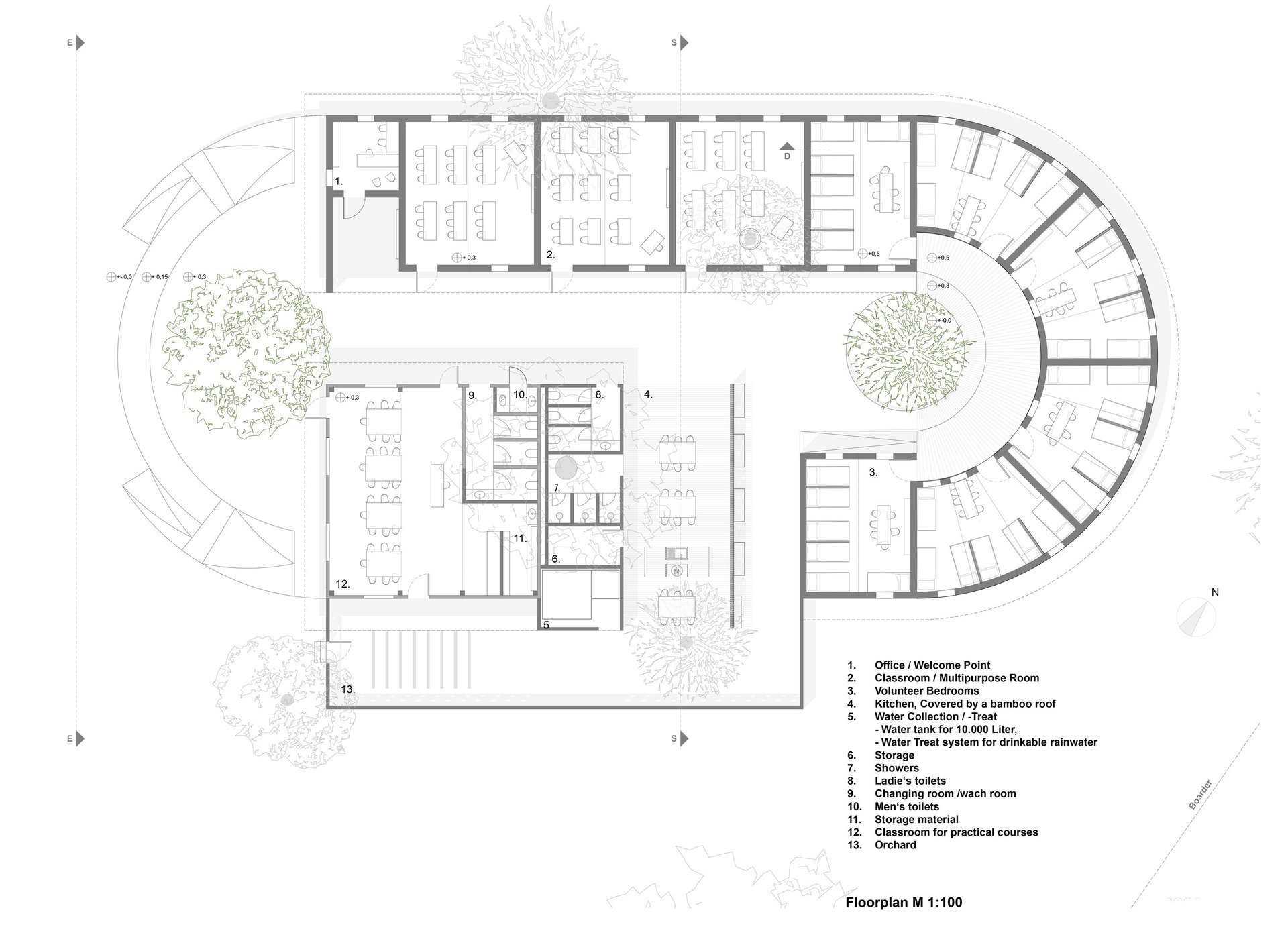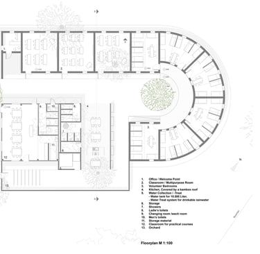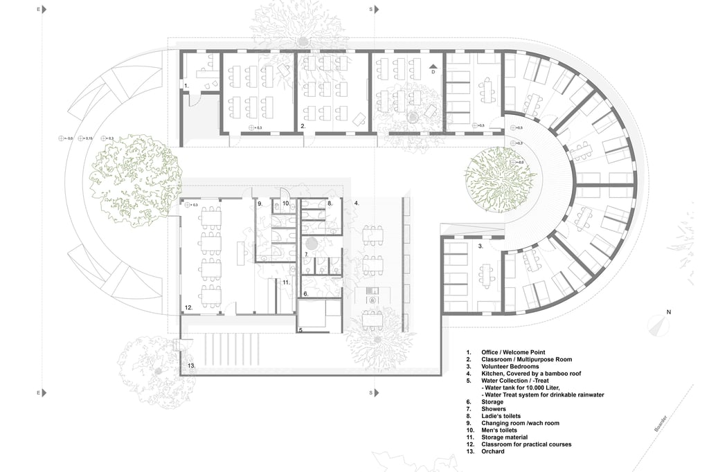 Der Grundriss ist klar strukturiert und schafft durch Bambusbedeckungen der Integration von Bäumen sichere, verschattete Bereiche um Rückzugsorte zu gewährleisten.