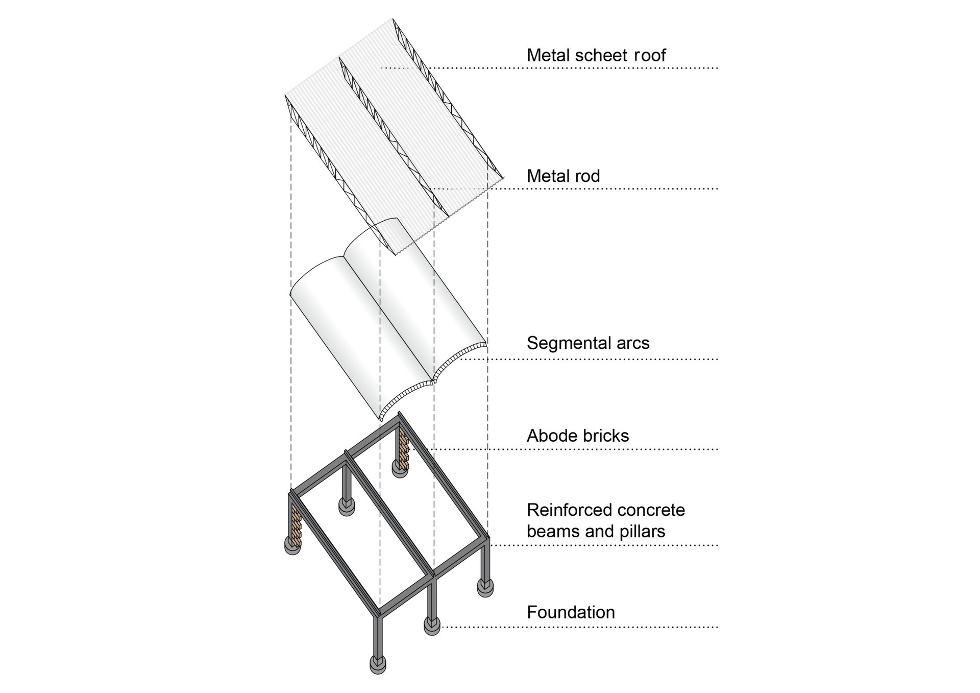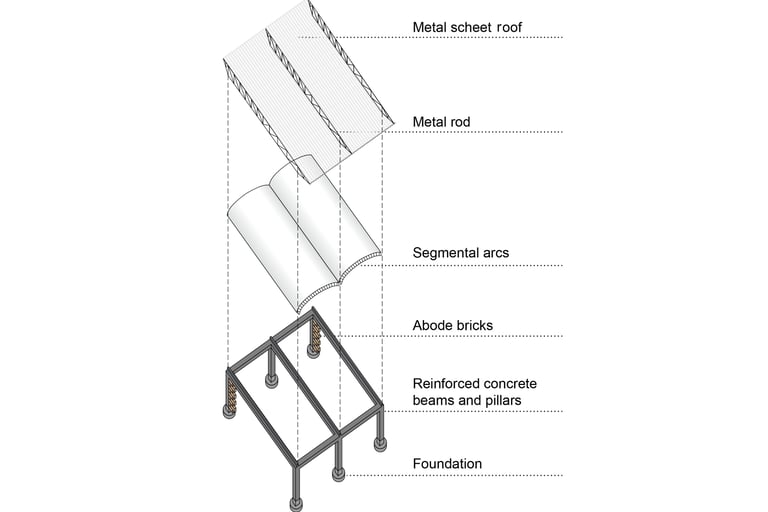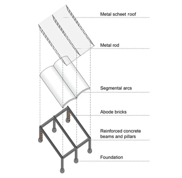 Für die Konstruktion wurde eine Kombination aus Lehmziegeln und bewährten Betonstützen und Trägern gewählt. Die starken Wände können Kälte speichern und verschaffen so den Räumen ein angenehmes Klima. Zudem entstehen durch gezielt gesetzte Öffnungen in den Wänden eine natürliche Luftzirkulation. Die Dachkonstruktion ermöglicht die Sammlung von kostbarem Regenwasser welches in die lokale Wasseraufbereitungsanlage geleitet wird und durch eine Solaranlage gespeist wird.