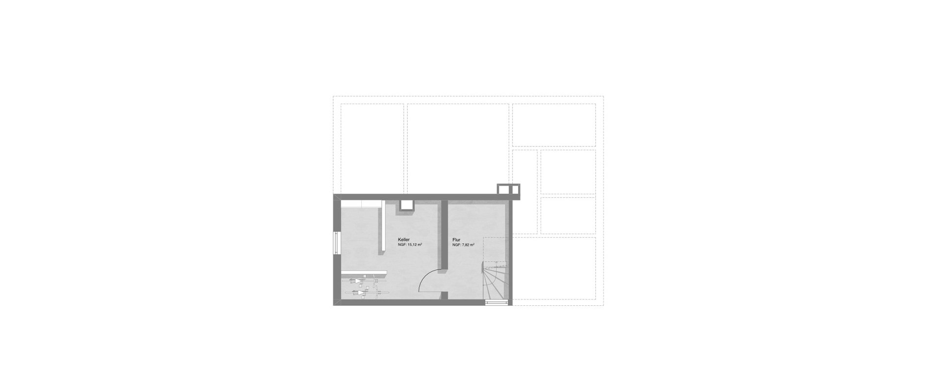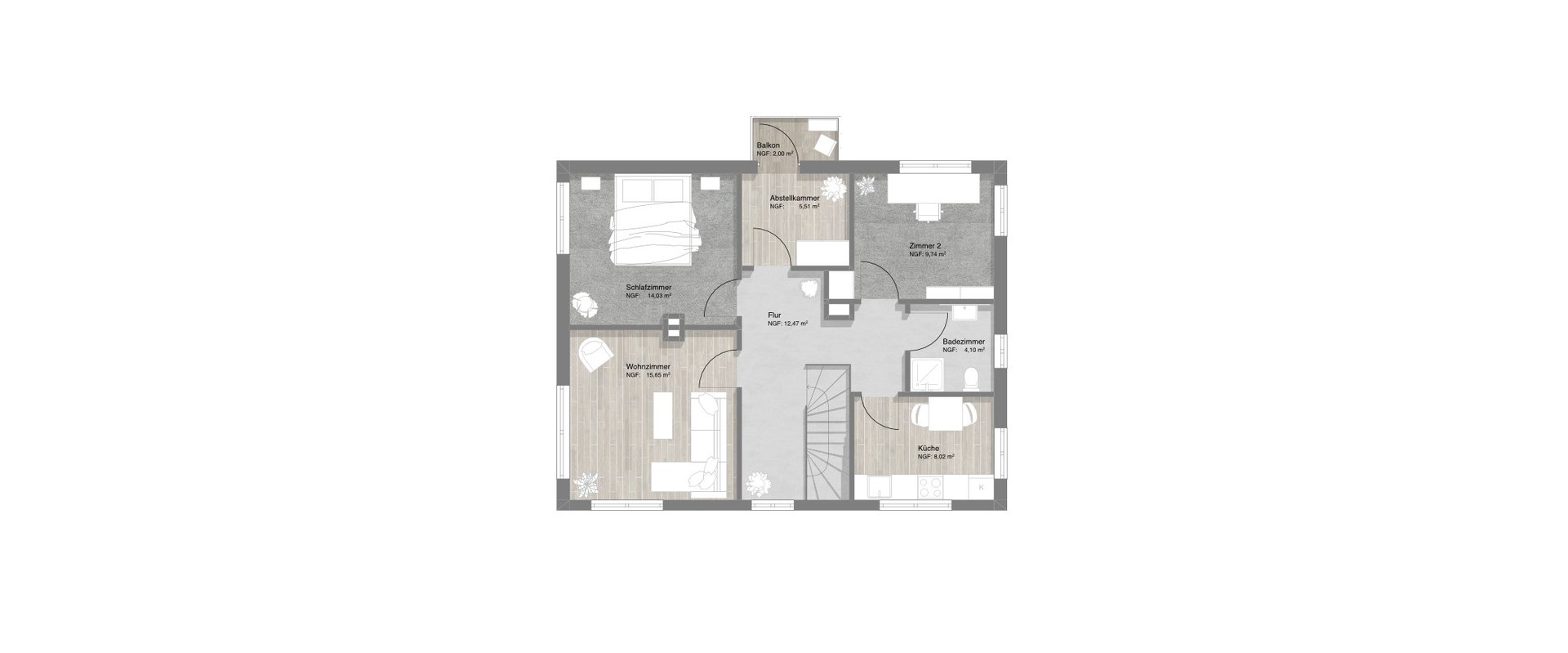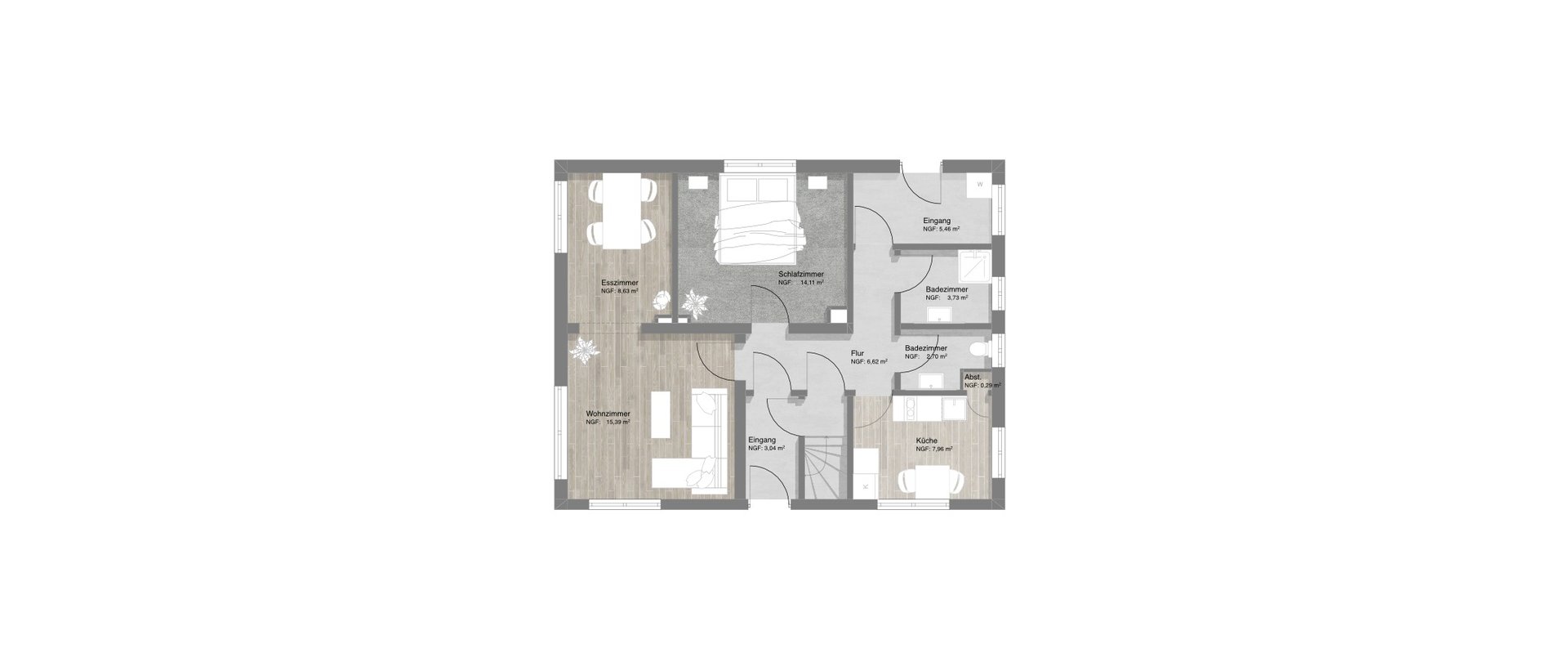 Schlichte, zurücknehmende Texturen verleihen den Grundrissen eine moderne Ästhetik, ohne zu überladen zu wirken. Die Möblierung und Sanitärobjekte werden dezent mit weißen Linien und Flächen angedeutet, um ein Gefühl des Raumes zu vermitteln, ohne diesen zu vereinnehmen.